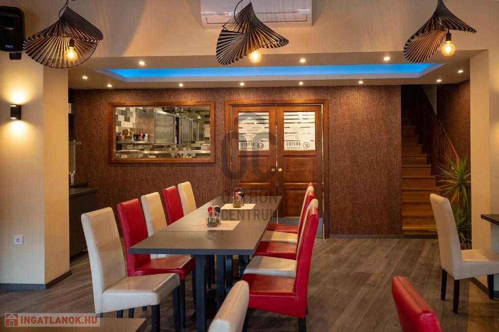 Az ingatlanhoz tartozik két meleg konyhás korszerűen felszerelt, gépiesített, engedéllyel bíró étteremmel is. A vendéglő rendelkezik az összes ÁNTSZ előírásnak megfelelő előkészítőkkel, mosogató helyiségekkel, raktárakkal, tálalóval, főzőhelységgel. A vendéglő rendelkezik egy 200 fő befogadására alkalmas belsőhelységgel valamint egy fedett, nagy fűthető terasszal, mely téliesíthető a szigetelt egymásba lapozható üvegfalak által. Egyedi dizájn és kivitelezés, hangulatvilágítás gondoskodik az esztétikai megjelenésről.
