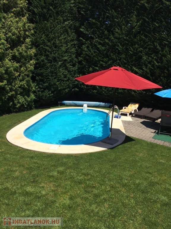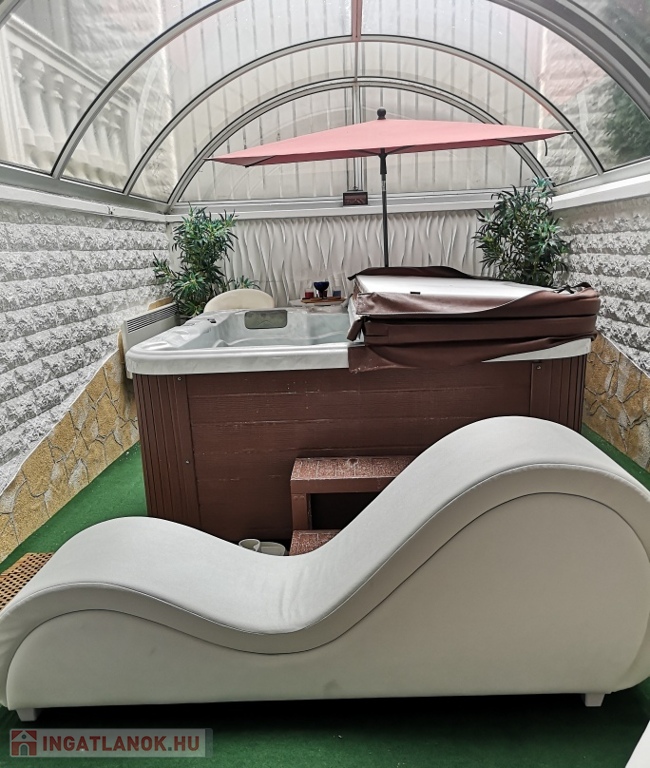 Családoknak, vállalkozóknak is ideális választás ez a ház! A kerti medence és a terasz körül 8-10 méter magas, átláthatatlan örökzöld tujasor van. Extra kényelmi felszereltség ( jakuzzi, infra szauna, solárium és fűtött kerti medence).