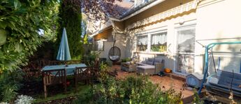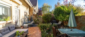 A gondozott, zöld növényekkel és árnyékot adó fákkal szegélyezett kert ideális pihenésre vagy családi kikapcsolódásra.